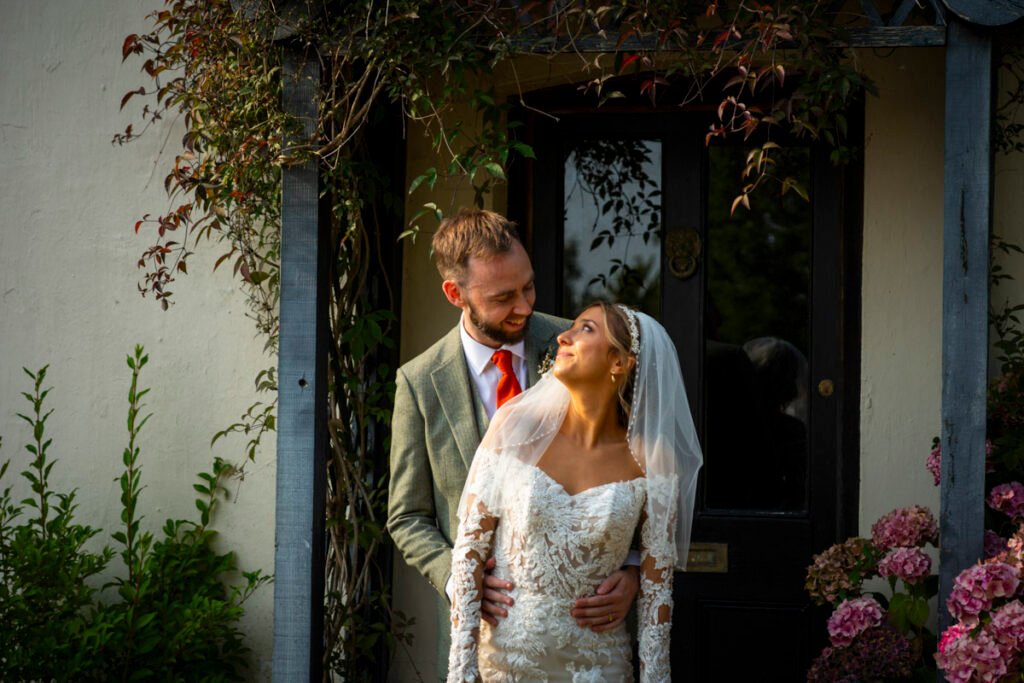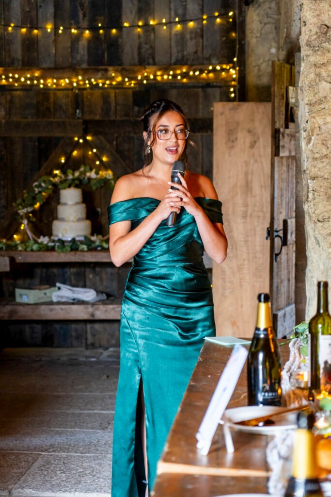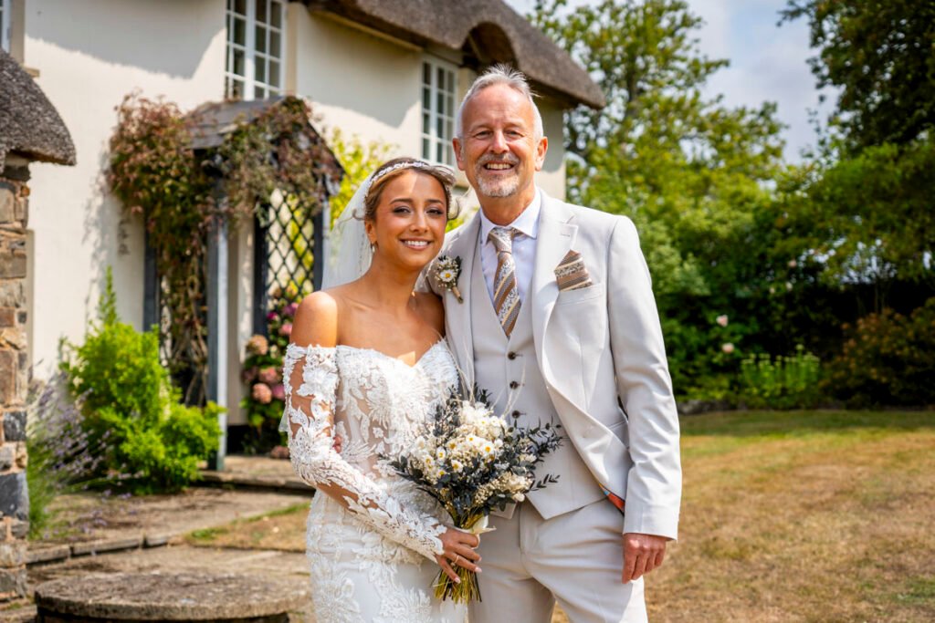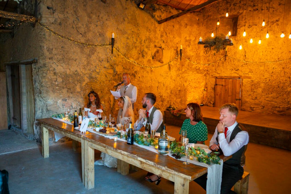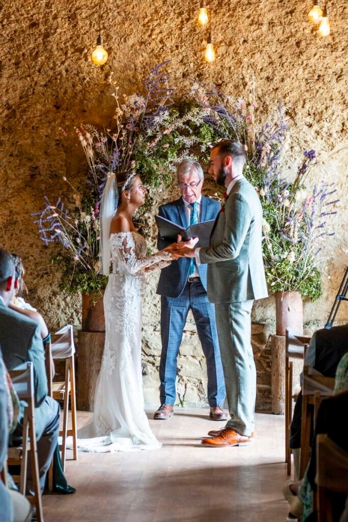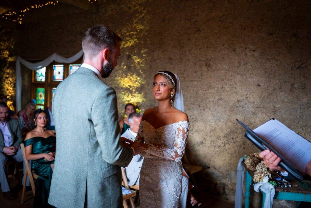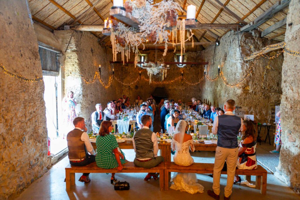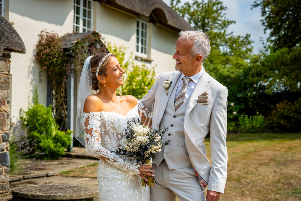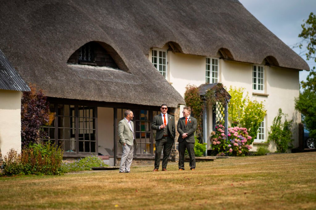They were married in the Threshing Barn a gorgeous rustic venue. It was a lovely day so canapes and champagne were served in the beautiful grounds with far reaching views of Dartmoor